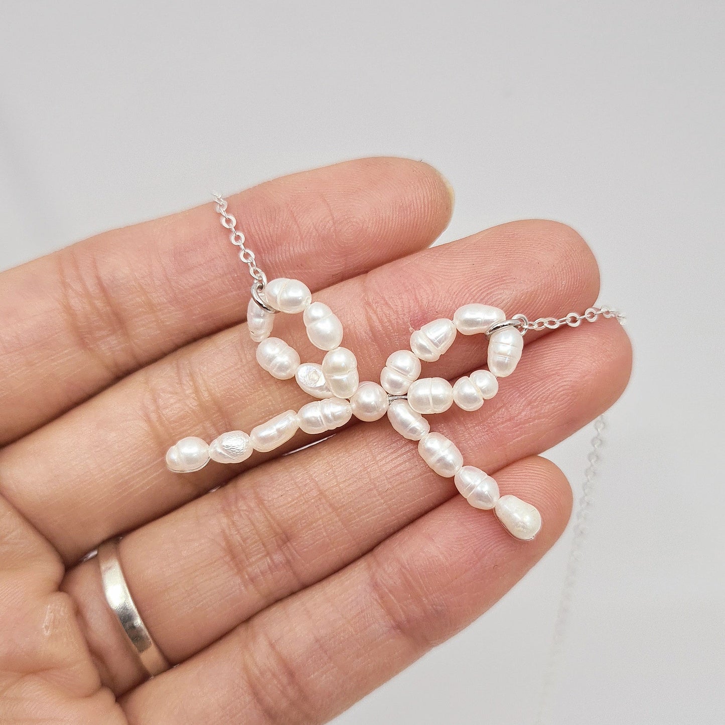The delicate cream-white freshwater baroque pearls are reminiscent of traditional bridal accessories, while the intricate hand-beading reflects fine craftsmanship and attention to detail.